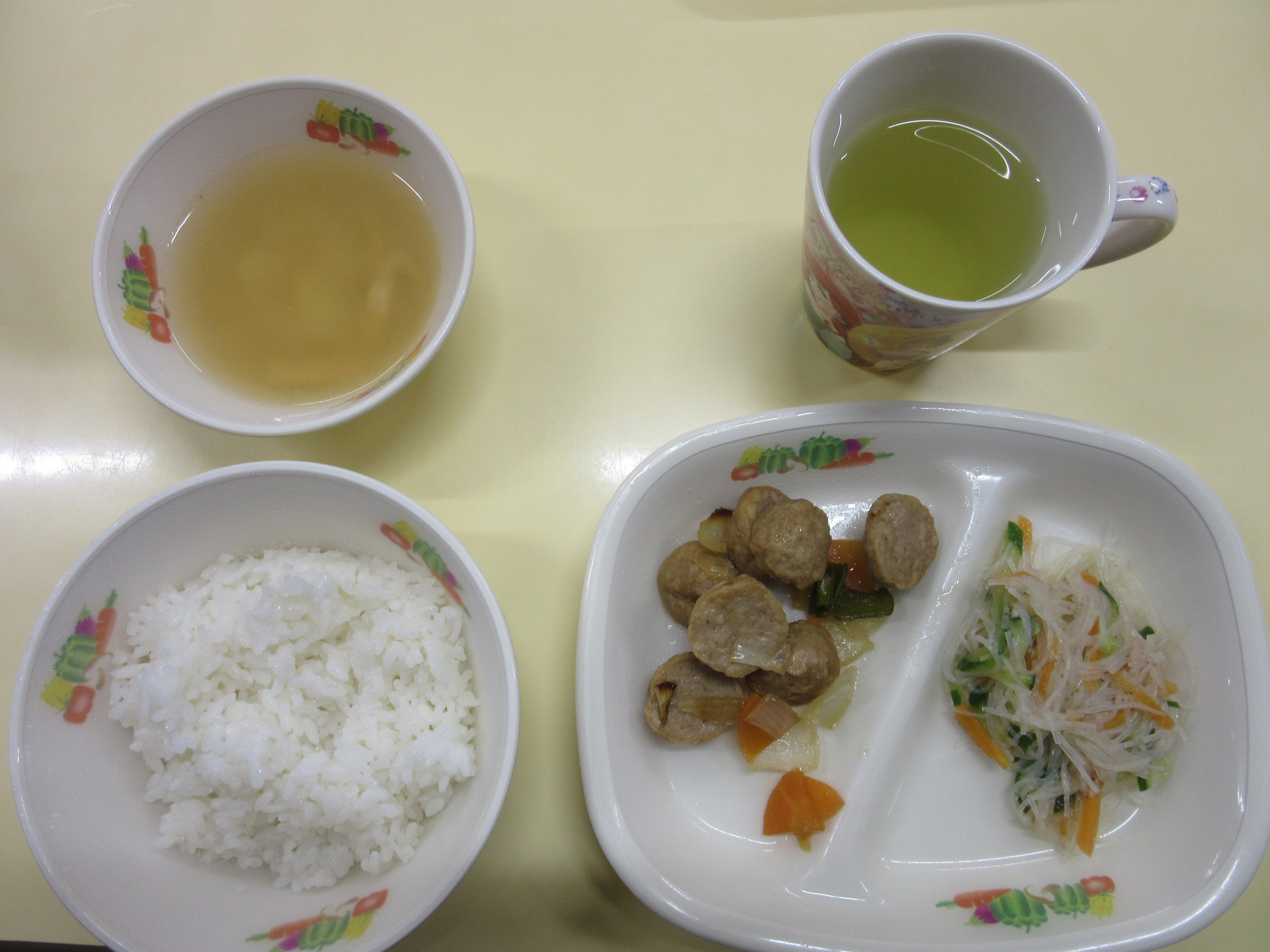 ご飯、肉団子と野菜の甘酢炒め、春雨の和風サラダ、じゃがいもとあげの味噌汁