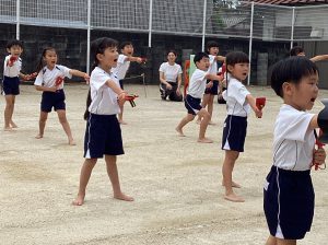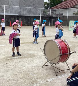 たくさんのお客さんを前にすると緊張している表情のお子様もおられましたが、皆と一緒に身体を動かしているうちに気持ちもほぐれ一生懸命にかけっこをゴールまで走り切ったり、友達と心と力を合わせて頑張る姿がみられました。
